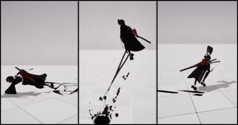 An impressive animation showcasing a character rig created in Maya and Unreal Engine, featuring a running anime warrior girl leaving ink-like footprints. The animation is still a work in progress with more updates to come.