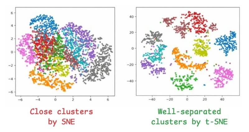 SNE and t-SNE are dimensionality reduction algorithms that project high-dimensional data into 2D for visualization. The key difference lies in their probability distributions: SNE uses Gaussian distributions for both high and low dimensions, resulting in crowded, poorly separated clusters. t-SNE replaces the low-dimensional