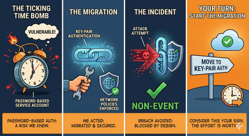 A real-world security incident where a Snowflake service account was targeted by repeated authentication attempts, but the attack was prevented by migrating from password-based authentication to RSA key-pair authentication combined with Network Security Policies (NSP). The post details the incident response, including SQL