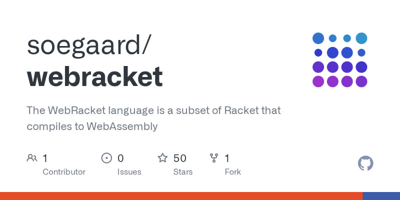 WebRacket is a compiler that translates a subset of Racket to WebAssembly for browser and terminal execution. It supports most Racket data types (fixnums, flonums, hash tables, structures), tail calls, multiple values, and exceptions, but lacks continuations, modules, and multi-threading. A JavaScript FFI enables DOM, Canvas,