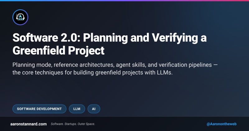 A detailed case study on building a greenfield SaaS product (TextForge, an AI email automation tool) using LLM-driven development practices the author calls 'Software 2.0.' Key techniques covered include: using Claude Code's planning mode to define requirements and architecture before writing code, providing reference