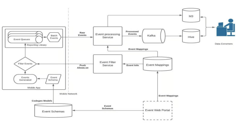 Uber redesigned its mobile analytics architecture to standardize event instrumentation across iOS and Android. The platform-led approach moved analytics responsibilities from feature-level code to shared infrastructure, defining standardized event types (taps, impressions, scrolls) that are code-generated from schemas and