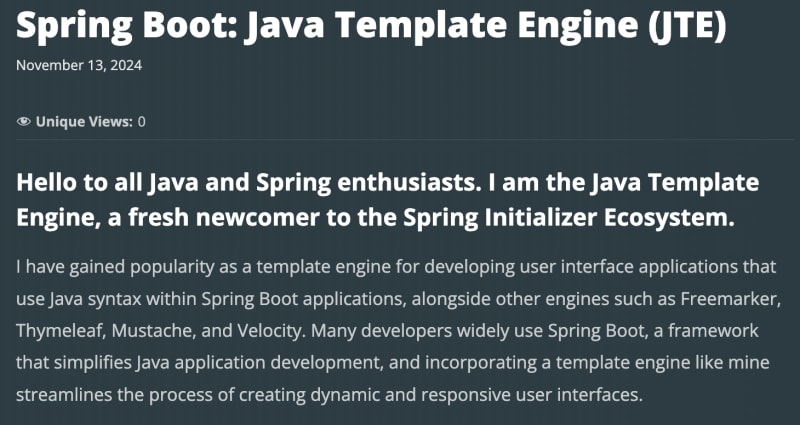 The Java Template Engine (JTE) is a new addition to the Spring Initializer Ecosystem, designed for developing user interface applications using Java syntax within Spring Boot applications. JTE provides a user-friendly syntax, supports plain Java or Kotlin expressions, and performs context-aware HTML escaping at compile time. It