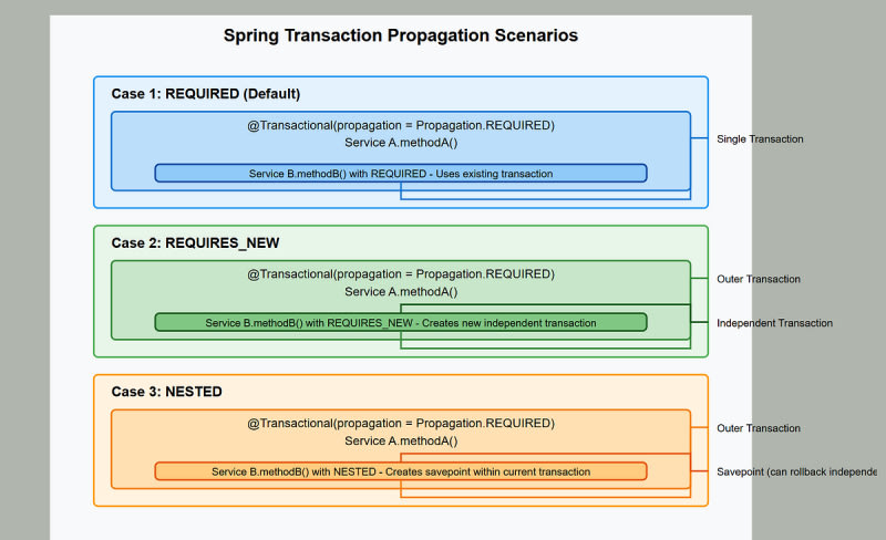 Spring Transaction Propagation GuideSpring Transaction Propagation: Complete GuideTransaction Propagation in SpringBasic ScenariosCore ConceptsKey Transaction AttributesPropagation OptionsREQUIRED (Default)REQUIRES_NEWNESTEDSUPPORTSNOT_SUPPORTEDNEVERMANDATORYCommon Use CasesCase 1: All-or-Nothing ProcessCase 2: Independent Logging or AuditingCase 3: Partial RollbackTransaction Isolation LevelsBest PracticesDebugging Transaction IssuesCommon Pitfalls to AvoidSort: