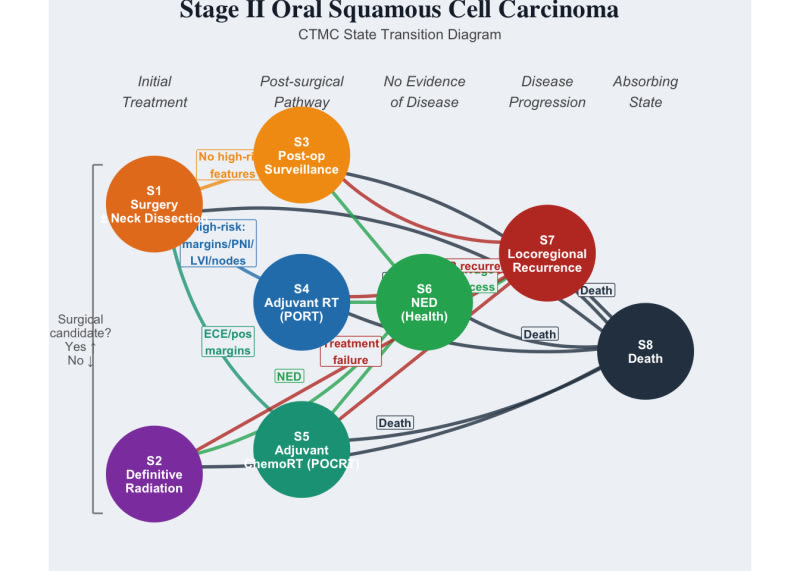A patient-perspective health economics model for Stage II oral squamous cell carcinoma (OSCC) is built using R and a continuous-time Markov chain (CTMC) framework. The model simulates a synthetic cohort of 1,000 patients choosing between surgery and definitive radiation therapy, tracking transitions through eight health states.