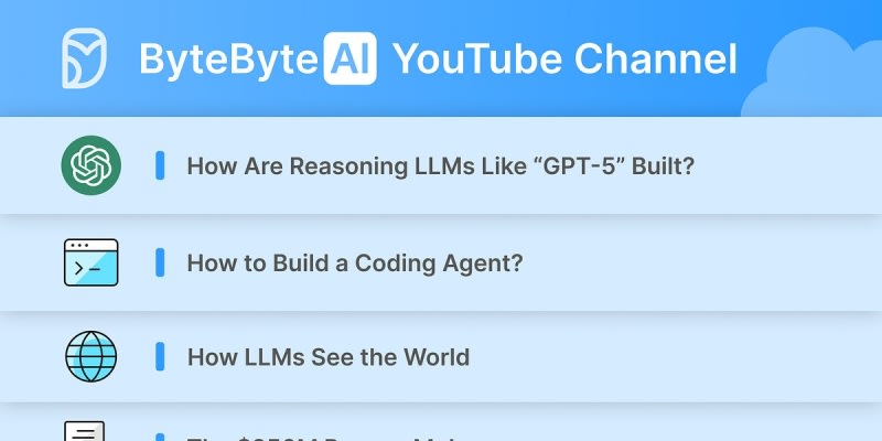 ByteByteGo has launched a new YouTube channel called ByteByteAI focused on AI education. The channel will publish weekly videos covering topics like reasoning LLMs, coding agents, prompt engineering, recommendation systems, and various AI concepts. The first video is already available with plans for regular content releases.