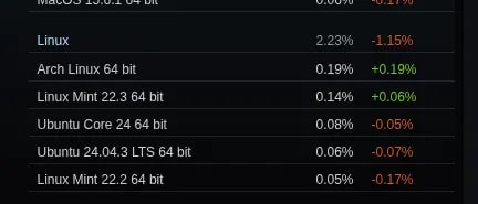 Valve's February 2026 Steam Survey shows Linux usage dropped to 2.23%, down 1.15 percentage points from January's 3.38%. The decline follows a pattern seen in previous months where a large spike in Simplified Chinese language usage correlates with anomalous drops in Linux share. Valve has historically issued corrected figures in such cases, so updated data may follow.