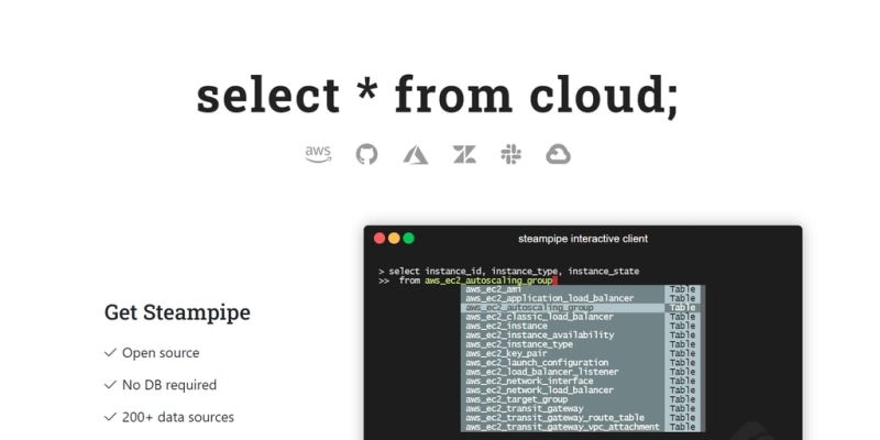 select * from AWS, Azure, GCP, Github, Slack etc. Open source project from Turbot, empowers cloud pros to query cloud. Steampipe: select * from cloud; select ‘*’ from any cloud service. The extensible SQL interface to your favorite cloud APIs is free and open source.