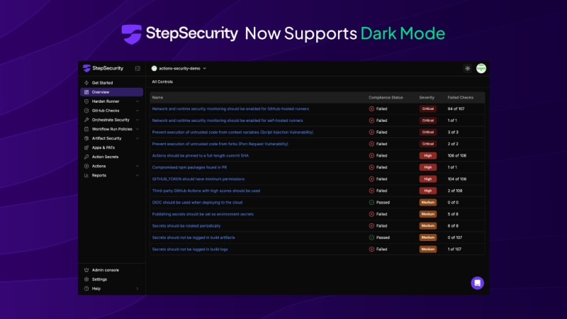 StepSecurity has added dark mode support to its CI/CD security platform. The feature follows system preferences automatically but can also be toggled manually. It was one of the most requested features from community and enterprise users, aimed at reducing eye strain during long security investigation sessions.