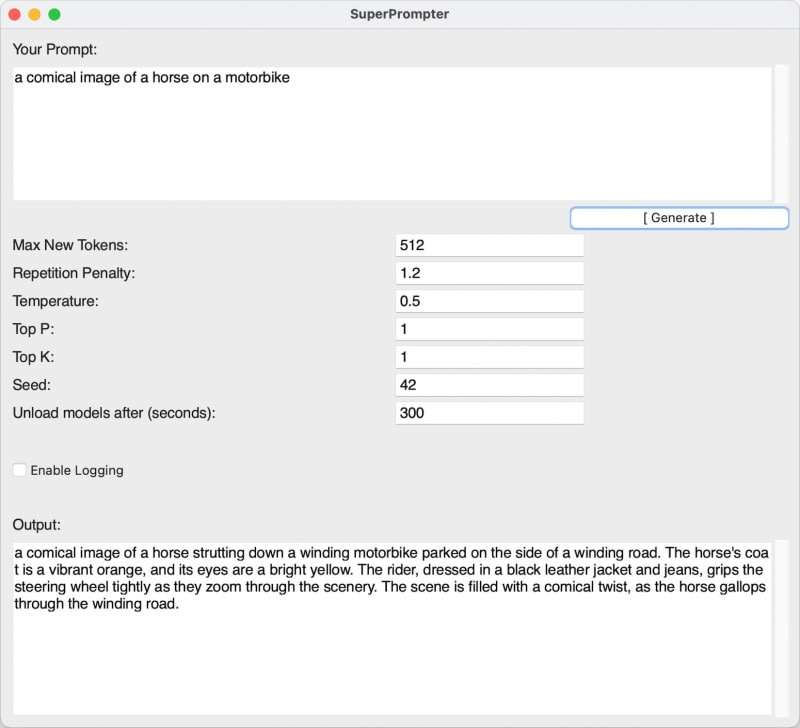 SuperPrompter is an open-source Python desktop application that uses the SuperPrompt-v1 model to enhance and optimize text prompts for AI image generation tools like Stable Diffusion. It features a tkinter-based GUI with customizable generation parameters (temperature, top-p, top-k, repetition penalty, seed), optional logging, and can be bundled into a standalone executable via PyInstaller. Prebuilt binaries are available, and the project is MIT-licensed on GitHub.