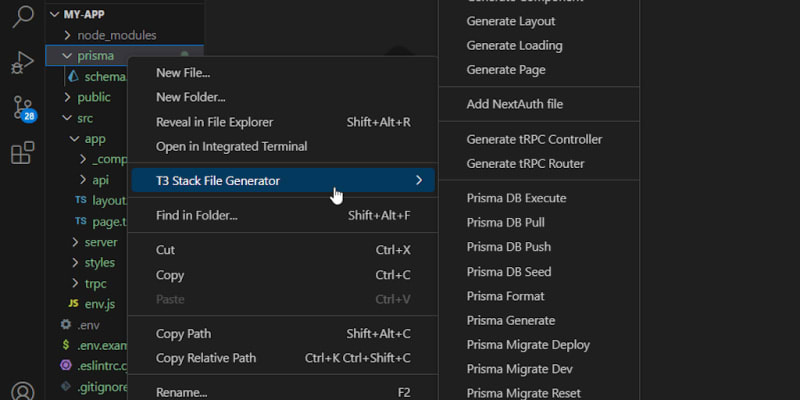 Boost your Next.js development with the T3 Stack extension for VSCode. Streamline file generation and optimize your project's lifecycle. Includes commands and snippets for Next.js, Prisma, tRPC, and key frameworks.