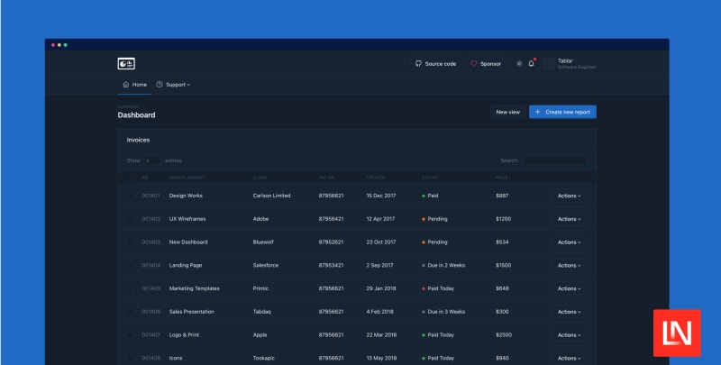 Using Tabler, you can access a free and open-source web application UI kit based on Bootstrap 5. This package has a demo you can experiment with at tablar.ebuz.xyz, which demonstrates a dashboard table, an alerts UI, a light/dark theme toggle, and more.
