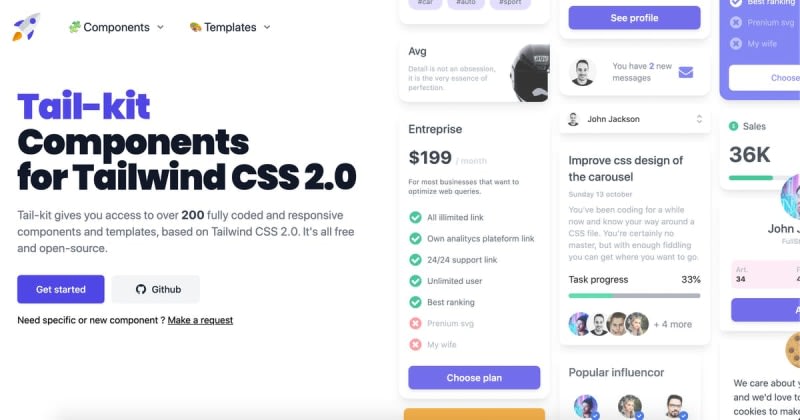 Tail-kit is a kit of components and templates fully coded with tailwind css 2.0 ready to copy paste. Made with React + NextJS + Typescript. Live code editor, you can change the components or templates code and see in live your modifications.