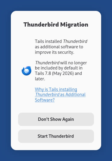Tails 7.5 has been released with several updates: Tor Browser updated to 15.0.7, Tor client updated to 0.4.9.5, and Thunderbird updated to 140.7.1. A notable change is that Thunderbird can now be installed as additional software from Persistent Storage, ensuring users always have the latest version and avoiding the recurring
