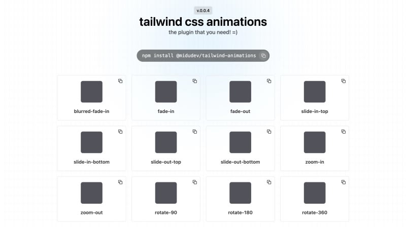 A comprehensive Tailwind CSS animations plugin by @midudev that provides over 60 pre-built animation classes for web developers. The plugin includes common animations like fade-in/out, slide transitions, rotations, bouncing effects, and complex animations like heartbeat, dancing, and jelly. Installation is straightforward via