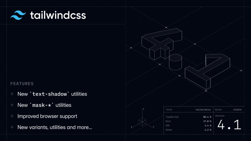 Tailwind CSS v4.1 introduces text-shadow utilities, mask elements with images and gradients, improved compatibility with older browsers, fine-grained text wrapping with overflow-wrap, colored drop shadows, and new utilities for targeting input devices. Additional features include aligning items to the last baseline, safe