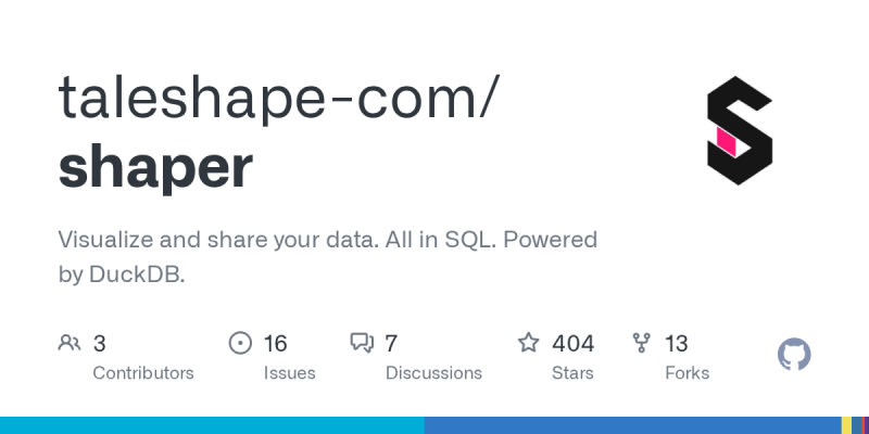 Shaper is an open-source, SQL-driven data dashboard tool powered by DuckDB. Dashboards are built purely by writing SQL with special type-cast annotations (e.g., `::BARCHART_STACKED`, `::XAXIS`) that define chart types and axes. Key features include self-hosting via Docker, git-based workflows, embedded analytics with