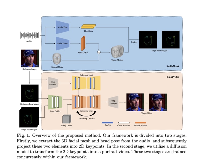 AniPortrait is a framework that generates high-quality portrait animations driven by audio and a reference image. It overcomes challenges in producing visually captivating animations by utilizing transformer-based models and a robust diffusion model. The framework comprises two stages: extracting facial mesh and head pose from