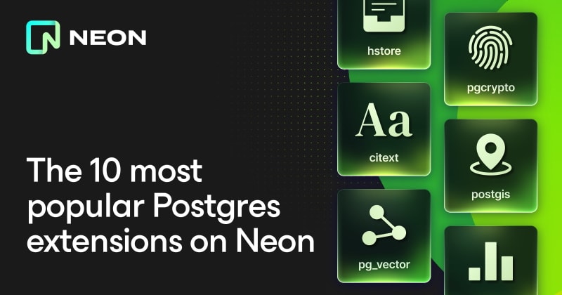 Neon analyzed usage data from thousands of PostgreSQL databases to identify the 10 most popular extensions. The list includes plpgsql and pg_stat_statements (both in 1M+ databases), uuid-ossp (80k+), pgvector (30k+), pgcrypto (20k+), pg_trgm (10k+), postgis (8k+), citext (4k+), unaccent (2.5k+), and hstore (1k+). Each extension