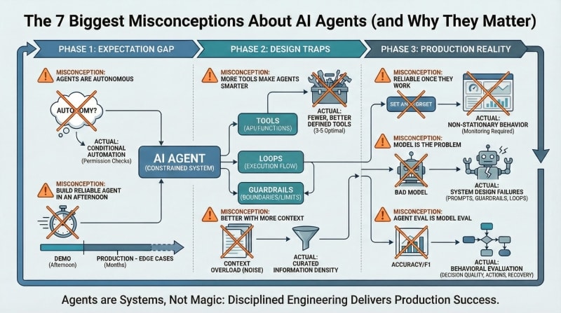 AI agents are conditional automation systems, not truly autonomous entities. Common misconceptions lead to production failures: agents require explicit boundaries and guardrails, prototypes differ vastly from production-ready systems, more tools and context often degrade performance, behavior is non-stationary requiring