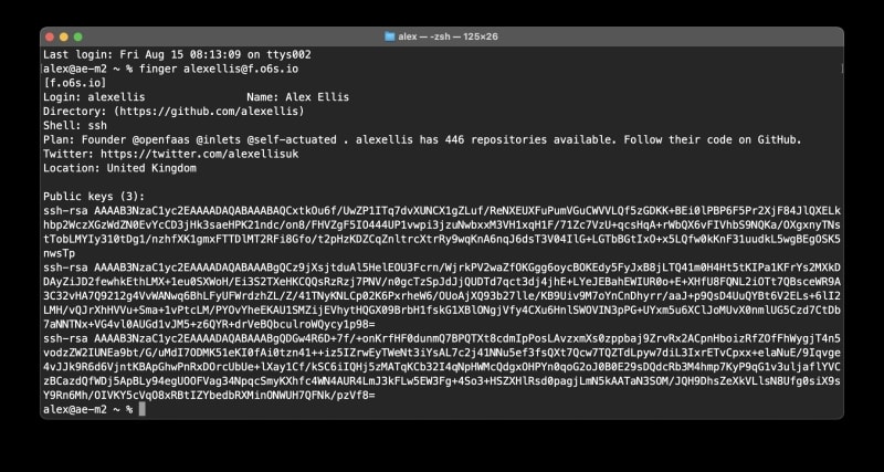 A nostalgic look at the `finger` command, a 1971 UNIX utility that let users query information about other users on shared systems. Still present on macOS today, it fell out of favour due to privacy concerns, the shift away from multi-user shared machines, and its plaintext nature. The post traces the history from Bell Labs and