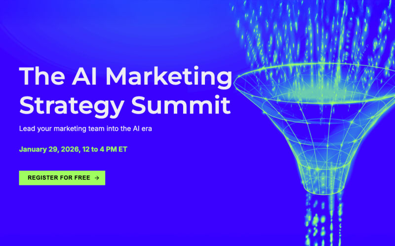 A virtual summit scheduled for January 29, 2026, bringing together marketing leaders from companies like HubSpot, Estée Lauder, and Zapier to discuss AI's impact on marketing strategies. The event covers AI applications in content creation, creative work, and emerging challenges like AIEO (AI Engine Optimization) and content differentiation.
