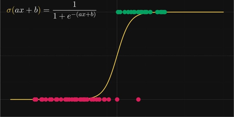 Logistic regression transforms geometric relationships into probability predictions through a step-by-step process. Starting with linear transformation (ax + b) to create logits, the model applies exponential functions and sigmoid activation to map any real number to a probability between 0 and 1. The geometric aspect becomes