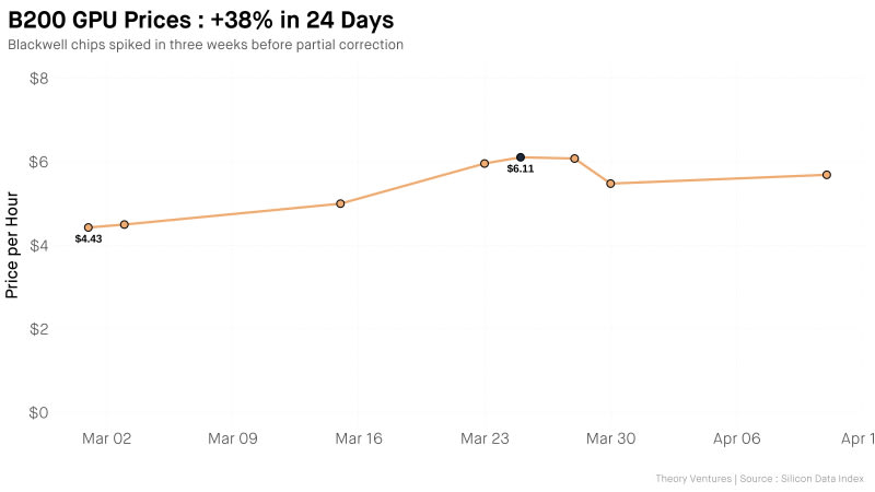 GPU rental prices for Nvidia Blackwell chips have surged 48% in just two months, reaching $4.08/hour, while CoreWeave raised prices 20% and extended minimum contracts to three years. OpenAI's CFO has acknowledged making tough trade-offs due to compute constraints, and Anthropic has limited its newest model to roughly 40