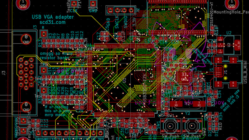 A developer built a custom USB-to-VGA converter to drive an arcade cabinet CRT at an unusual 336x262 resolution. The solution uses the GUD USB display protocol implemented on an STM32 microcontroller, delivering 34-bit color. The journey involved experimenting with RP2040 PIOs, resistor ladder DACs, and custom kernel modules before arriving at the final design.
