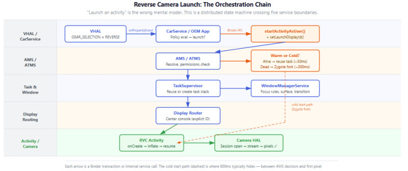 A deep-dive into Android Automotive OS (AAOS) rear-view camera (RVC) latency debugging, specifically an 800ms delay that consumed 40% of the FMVSS 111 regulatory compliance budget. The post traces the full signal chain from CAN bus gear change through VHAL, CarPropertyManager, ActivityManagerService, Zygote fork, and