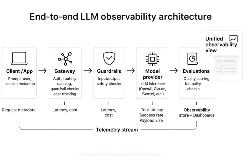 A comprehensive framework for implementing LLM observability in production systems. Covers the architecture, telemetry models, and KPIs needed to monitor large language model applications across reliability, quality, safety, cost, and governance dimensions. Explains how to trace multi-step agent workflows, implement guardrails,