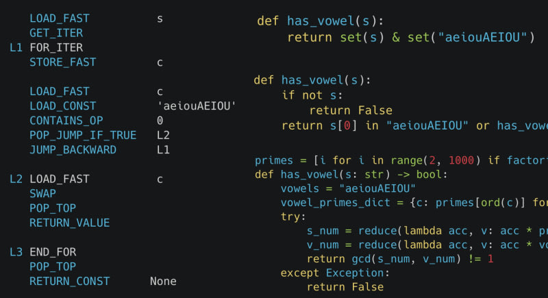 A comprehensive performance analysis of 11 different methods to detect vowels in strings using Python. The study reveals that regex methods significantly outperform traditional loops due to CPython's interpreter overhead and optimized C implementations. Through bytecode analysis and CPython source code examination, the author