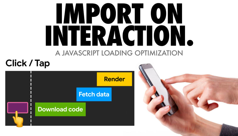 Lazily importing feature code on interaction is a pattern used in many contexts. This can be achieved in many ways (defer until interaction, until the browser is idle or using other heuristics) The different ways to load resources are, at a high-level: Eager - load resource right away (the normal way of loading scripts) Preload