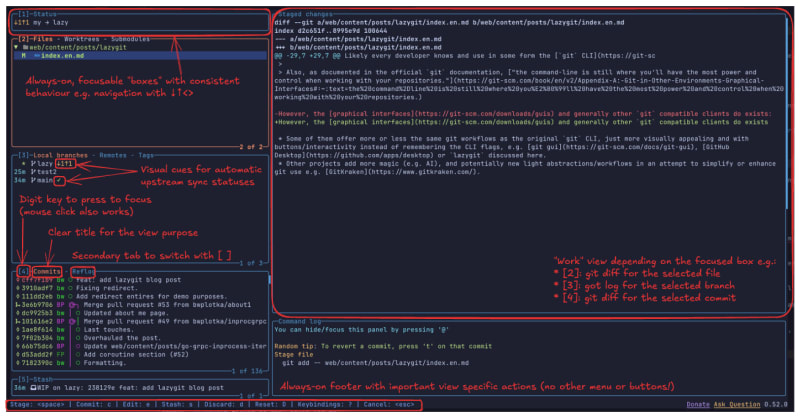 Lazygit is a terminal-based Git UI that enhances productivity through consistency, discoverability, and interactivity. The tool maintains Git CLI terminology while providing visual guidance for operations like interactive rebasing, cherry-picking, and commit patching. Its vim-style keybindings enable quick workflows (e.g., amending and force-pushing in 5 keystrokes), while interactive prompts prevent mistakes and teach better Git patterns. The TUI approach delivers speed and portability without overwhelming users, making complex operations like splitting commits or selective line resets significantly simpler than traditional CLI or GUI alternatives.