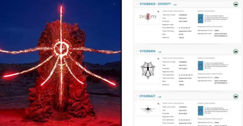 A mysterious statue placed in the Mojave Desert by The Game Awards organizers appears to be teasing a new Divinity game from Larian Studios. Three recently filed trademarks show a new Divinity logo with an eye icon matching the statue, and tentacle-like symbols that mirror the statue's design. Larian's Director of Publishing