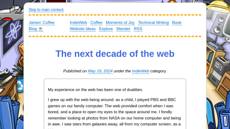 The web can be a place of empowerment and expression, but also anxiety and disempowerment. The IndieWeb community aims to change the web and put people in control. The author encourages readers to have their own personal websites and contribute to the idea that the web is for people. Change is possible through tools like Mastodon and by reaffirming the foundations of the web.