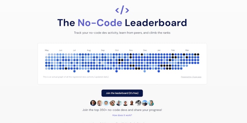 A leaderboard for no-code developers that tracks their activity and ranks them based on factors like time spent, edits, and deploys.