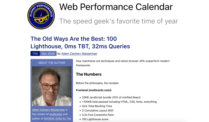 A developer achieves exceptional performance metrics (100 Lighthouse score, 0ms Total Blocking Time, 32ms queries) by rejecting modern frameworks in favor of older techniques. The approach uses DATAOS (DOM As The Authority On State), treating the DOM itself as the state container instead of maintaining separate state objects,
