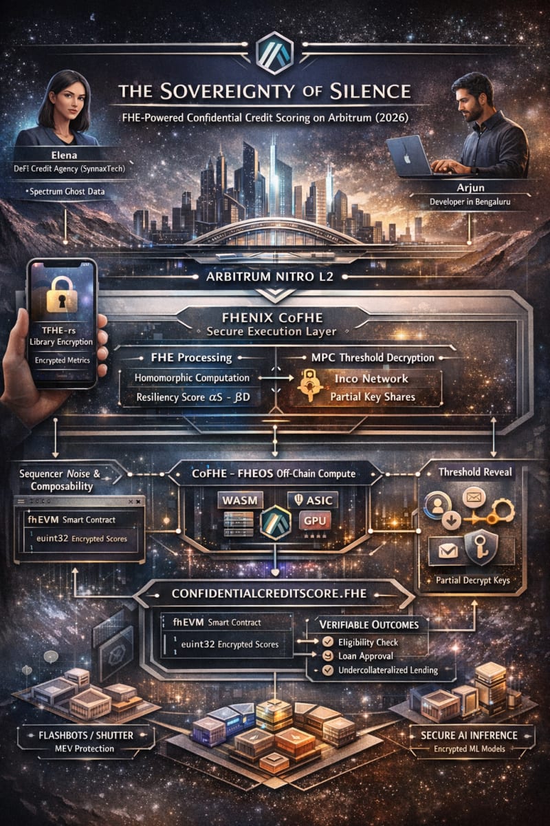 Fully Homomorphic Encryption (FHE) enables confidential computation on public blockchains, allowing data to remain encrypted while being processed. This technical narrative explores implementing an FHE-powered credit scoring dApp on Arbitrum using Fhenix's CoFHE framework. The implementation uses TFHE-based lattice schemes to