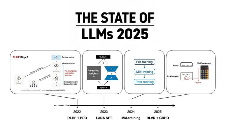A comprehensive 2025 review of large language model developments highlights reinforcement learning with verifiable rewards (RLVR) and the GRPO algorithm as the year's dominant training paradigm, following DeepSeek R1's breakthrough. Key trends include inference-time scaling, tool use integration, and architectural efficiency