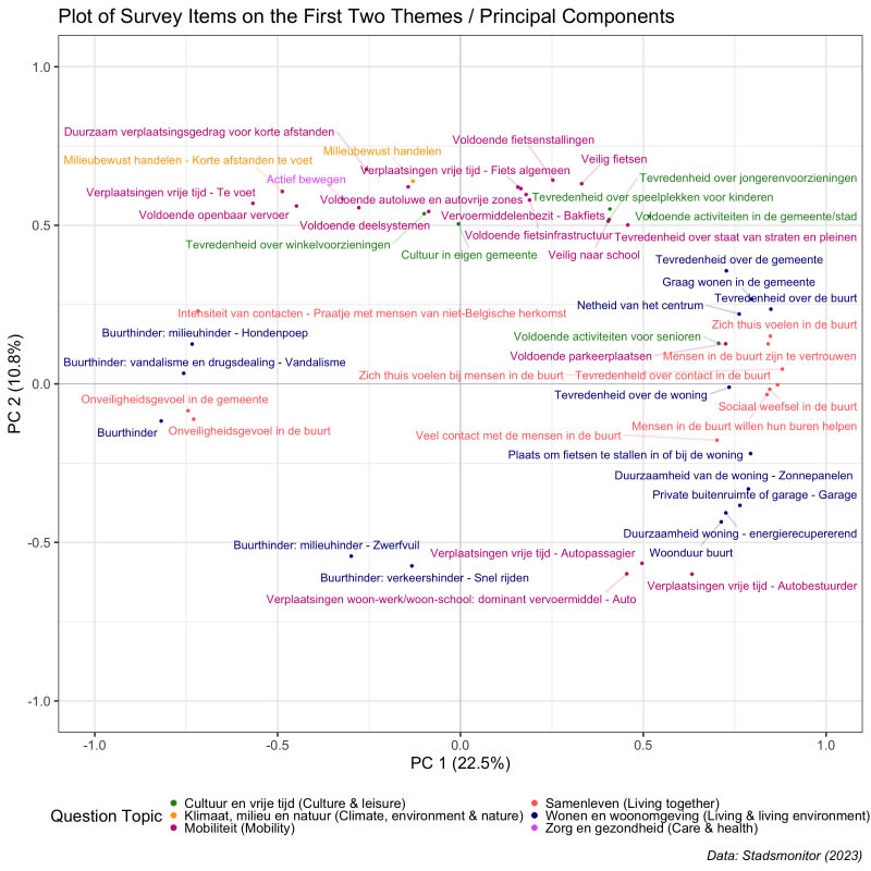 This blog post analyzes the summary data from the Gemeente-Stadsmonitor survey conducted in Flanders, Belgium. It uncovers the main themes of the survey using principal components analysis. The first theme revolves around feelings about one's place of residence, while the second theme focuses on transport and mobility. The