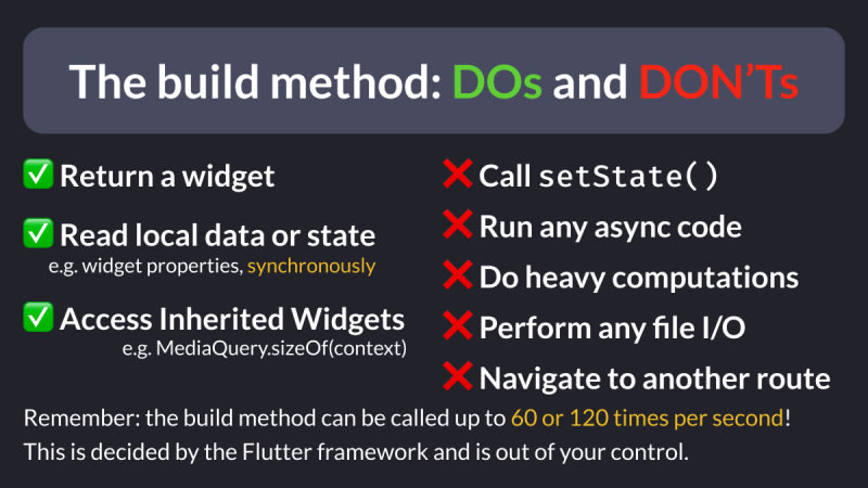 The widget build method can be called during every frame and should not have side effects. Instead, side effects should be handled inside widget callbacks, which are triggered by separate events. This approach maintains the rendering phase's integrity.