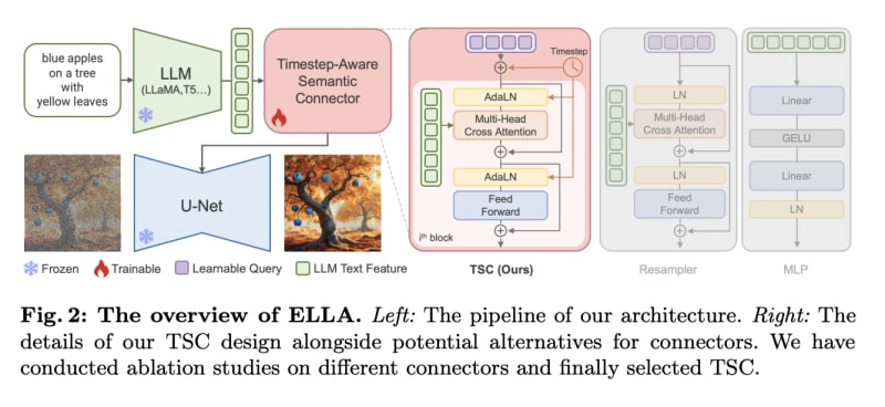 ELLA is a novel method that integrates powerful Large Language Models (LLMs) into text-to-image diffusion models to enhance their capabilities in handling complicated prompts. It introduces the Timestep-Aware Semantic Connector (TSC) for dynamic semantic alignment. ELLA performs superiorly in complex prompt following,