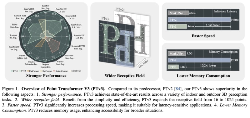 Point Transformer V3 (PTv3) is an advanced technology for point cloud processing that prioritizes simplicity and efficiency. It achieves scalability by using serialized mapping instead of precise neighbor search. PTv3 has shown remarkable results in over 20 tasks across indoor and outdoor scenarios, emphasizing the impact of