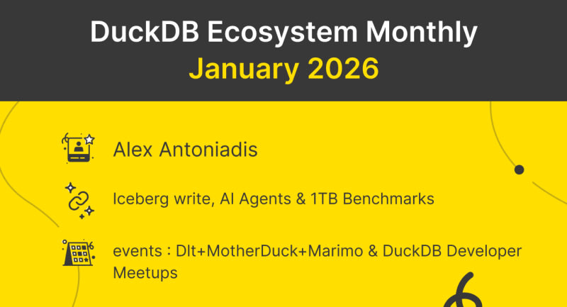 DuckDB ecosystem January 2026 roundup covering major updates: Iceberg extension now supports full DML operations (INSERT, UPDATE, DELETE) with improved metadata handling; DuckDB-Wasm enables browser-based Iceberg queries; TypeScript scripts can function as table functions via shellfs extension; benchmarks show 1TB dataset