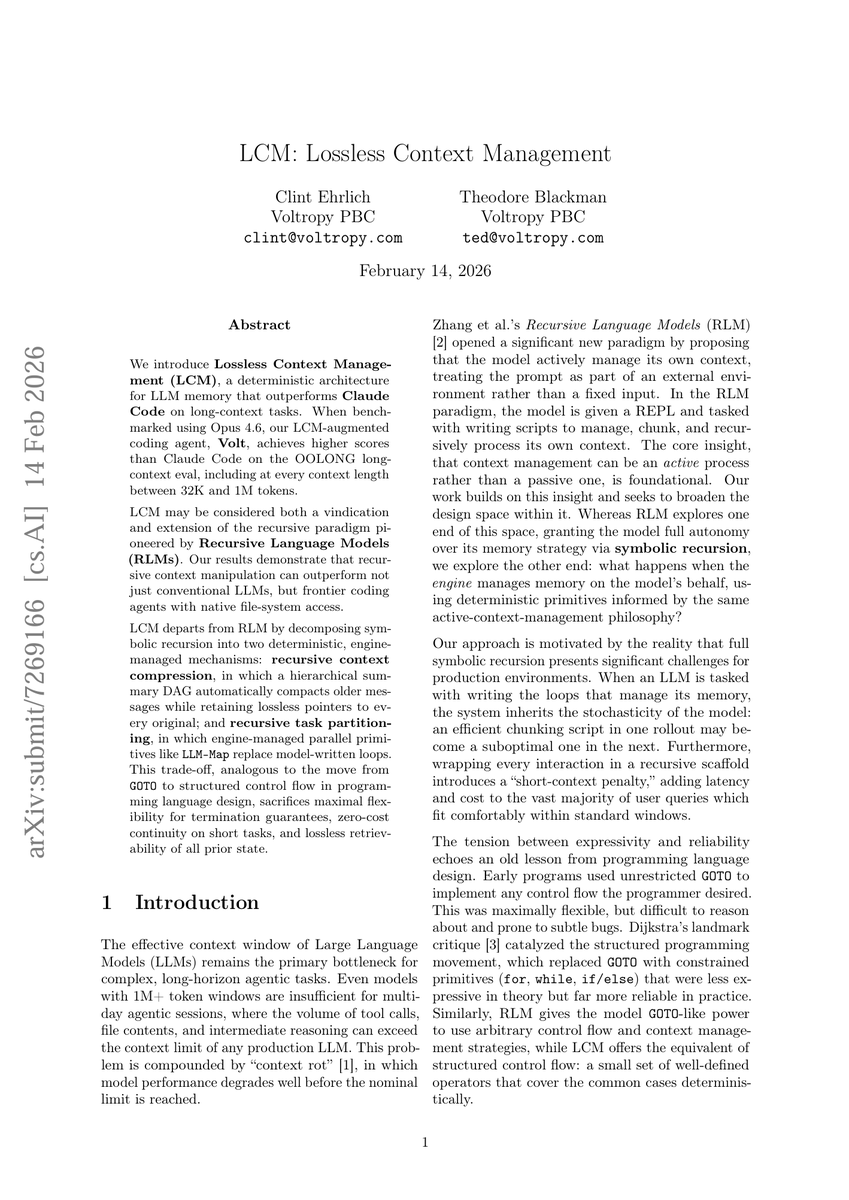 this paper from Voltropy shows why agents should stop letting models manage their own memory ☠️ the idea is called Lossless Context Management (LCM). and the framing alone is worth your time. Recursive Language Models (RLMs) gave models full autonomy to write their own memory scripts. the model gets a REPL, writes Python loops to chunk and process its own context. maximally flexible. also maximally unpredictable. an efficient chunking script in one rollout becomes a bad one in the next. LCM flips this entirely. instead of asking the model to invent a memory strategy, the engine handles it deterministically. old messages get compressed into a hierarchical DAG of summaries, but every original is preserved verbatim in an immutable store. the model never loses access to anything. it just sees progressively compressed views with stable pointers it can expand on demand. the analogy they use is perfect: GOTO vs structured programming. early programs used unrestricted GOTO for any control flow the programmer wanted. maximally expressive. also impossible to reason about at scale. Dijkstra's critique replaced GOTO with constrained primitives (for, while, if/else) that were less flexible in theory but far more reliable in practice. RLM gives models GOTO-level power over their own context. LCM gives them structured control flow. less expressive. dramatically more predictable. the results back this up. their agent Volt (running Opus 4.6) beats Claude Code on the OOLONG long-context benchmark at every single context length from 32K to 1M tokens. average improvement over raw Opus 4.6: +29.2 for Volt versus +24.7 for Claude Code. at 512K tokens the gap is +42.4 vs +29.8. at 1M it's +51.3 vs +47.0. below 32K both systems perform about the same. that's expected. when the full input fits in context, the architecture doesn't matter much. LCM's zero-cost continuity means it adds no overhead in this regime either. no latency penalty for short tasks. where it gets interesting is how they handle parallelism. instead of the model writing loops to process large datasets, LCM introduces two deterministic operators: LLM-Map (stateless parallel processing, one LLM call per item) and Agentic-Map (full sub-agent per item with tool access). single tool call from the model. the engine handles all iteration, concurrency, retries, and schema validation. Claude Code's approach: the model reads files linearly or writes bash scripts to split and process them. flexible, but the model has to correctly implement chunking logic every time AND maintain coherent state across chunks in its own context window. two sources of error compounding on each other. Volt's approach: the model never sees the raw dataset. it specifies a per-item prompt and output schema. the engine returns aggregated results. context saturation stops being a failure mode entirely. they also solve a problem i haven't seen addressed this cleanly before: infinite delegation. when sub-agents can spawn sub-agents, you risk an agent delegating its entire task downward forever, doing no actual work. LCM enforces a scope-reduction invariant. every sub-agent must declare what work it's delegating AND what work it's keeping. if it can't articulate what it's retaining, the call gets rejected. no arbitrary depth limits needed. the recursion is structurally guaranteed to terminate. the limitations section is honest, which matters. they acknowledge OOLONG has contamination issues (Opus 4.6 sometimes recognizes the underlying dataset from training data). they decontaminated by excluding tasks where reasoning traces showed memorization. the overall finding holds but the gap narrows. they also argue for procedurally generated benchmarks going forward, which is the right call. the deeper implication is one we keep relearning from software engineering history: how you manage what the model sees may matter more than giving the model tools to manage it itself. every agent framework shipping with "let the model figure it out" memory strategies might be building on the wrong abstraction entirely. not because model autonomy is bad. but because deterministic infrastructure solving the common cases reliably is almost always better than stochastic flexibility solving every case unpredictably. less GOTO. more structured control flow. the lesson keeps repeating.