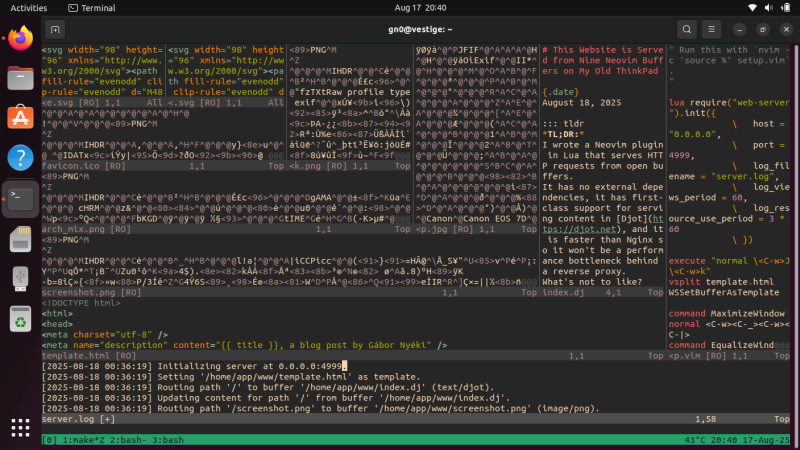 A developer created a Neovim plugin that serves HTTP requests directly from editor buffers using pure Lua. The plugin leverages Neovim's libuv bindings for asynchronous I/O and surprisingly outperforms Nginx in benchmarks due to LuaJIT's efficiency and NaN tagging optimization. The implementation serves a static website from