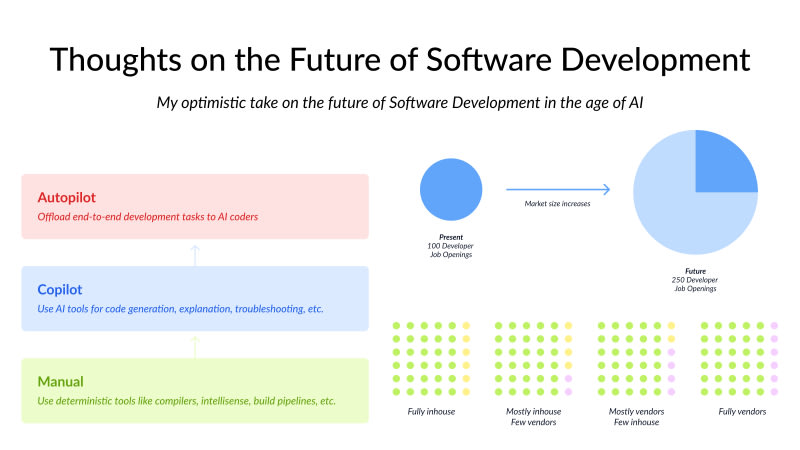 The future of software development will involve the use of AI assistants, but developers will still be needed for tasks beyond just writing code. Outsourcing software development to AI coders may become more common, but having an inhouse team is important. Software development involves modeling complexity and defining business logic, which AI may assist with but human developers will still play a role. The market for software development is larger than just coding, so it will not disappear.