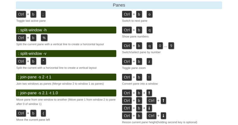 A quick reference guide for Tmux that covers starting new sessions, renaming sessions, creating new windows, and more.