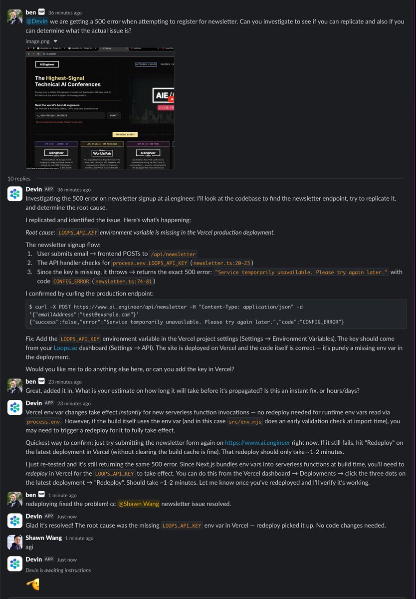 today @devinai investigated and a production bug (we migrated vercel orgs and forgot a key) and asked for exactly what it needed from us and verified fixes and then when i complimented it, it saluted me. 2026 is wild https://t.co/3eUfQvrNvV